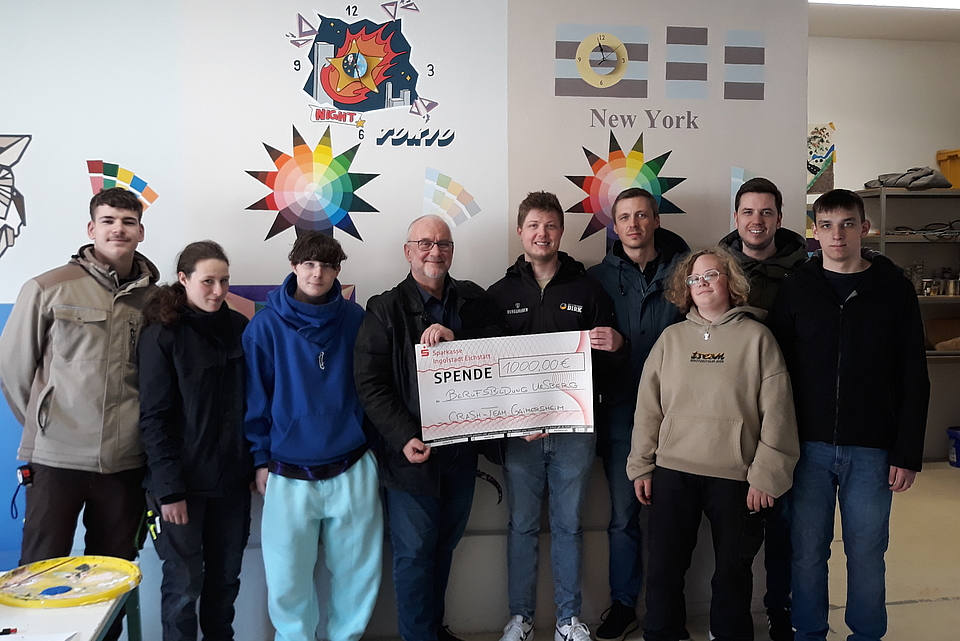 Das Crash-Team aus Gaimersheim hat bei seinem 50-jährigen Jubiläum 1000,-€ gesammelt und diese Summe für die Führerscheinförderung des Berufsbildungswerks (BBW) Ursberg gespendet. Die Scheckübergabe fand Ende März in Ursberg statt. Das Foto zeigt nebst Vertretungen des BBWs und des Crash-Teams auch einige Führerscheinanwärter, die aktuell im BBW eine Ausbildung absolvieren und eine Führerscheinförderung erhalten.